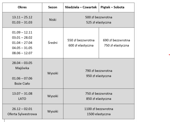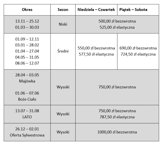 W opcji elastycznej istnieje możliwość rezygnacji lub dokonywania zmian w rezerwacji do 14 dni przed przyjazdem w sezonie niskim i do 30 dni przed przyjazdem w sezonie wysokim.
